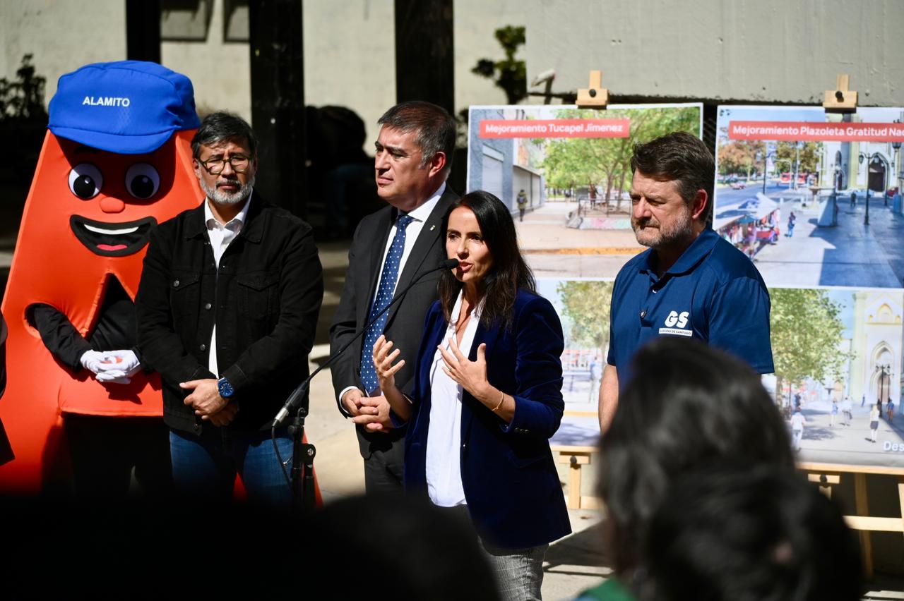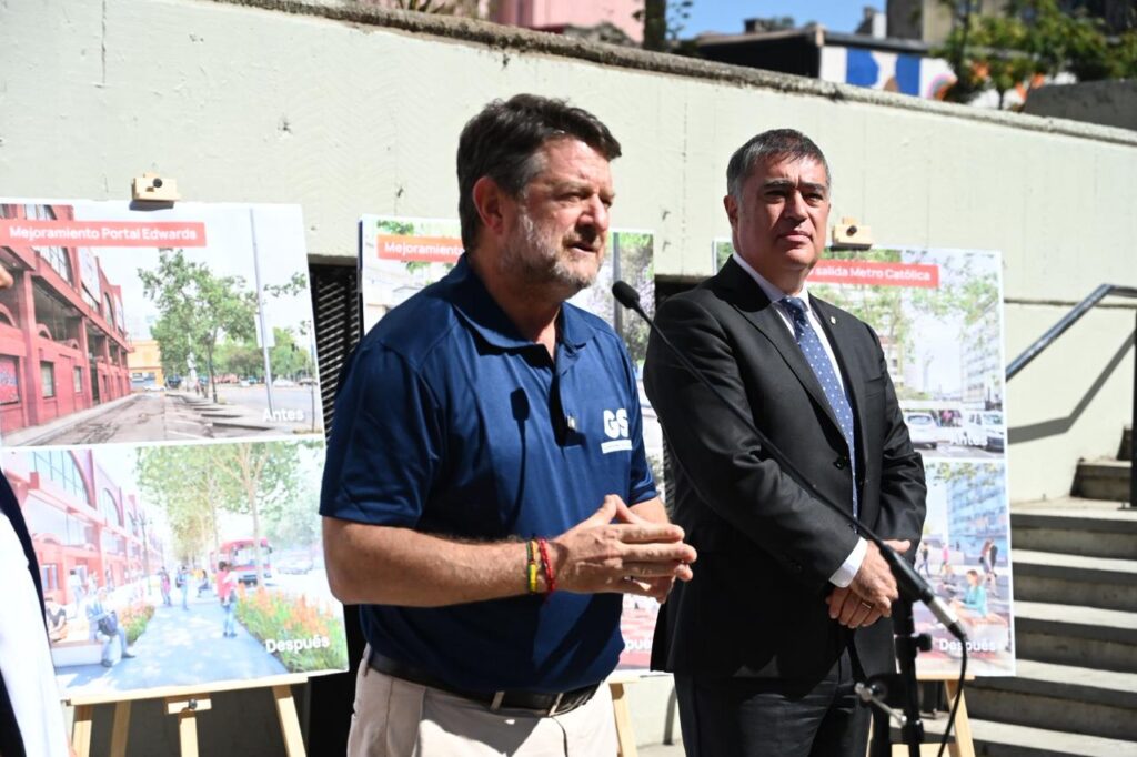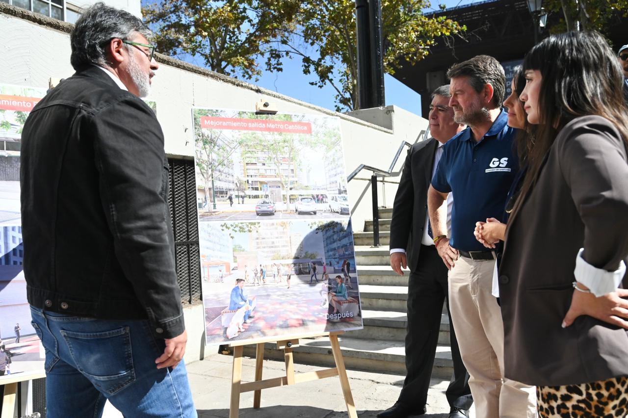 Lunes 6 de abril de 2026.-En la salida sur del metro Universidad Católica, el Gobernador de Santiago, Claudio Orrego, junto al alcalde de Santiago, Mario Desbores, y la decana de la Facultad de Arquitectura de la Pontificia Universidad Católica, Magdalena Vicuña, dio a conocer los nuevos trabajos que se están realizando en cinco puntos del eje Alameda: el Portal Edwards, la Plazoleta Gratitud Nacional, la misma salida sur del Metro Universidad Católica, la Plaza Tucapel Jimenez y la Plaza Oriente, entre Jaime Eyzaguirre y la Plaza de Carabineros.