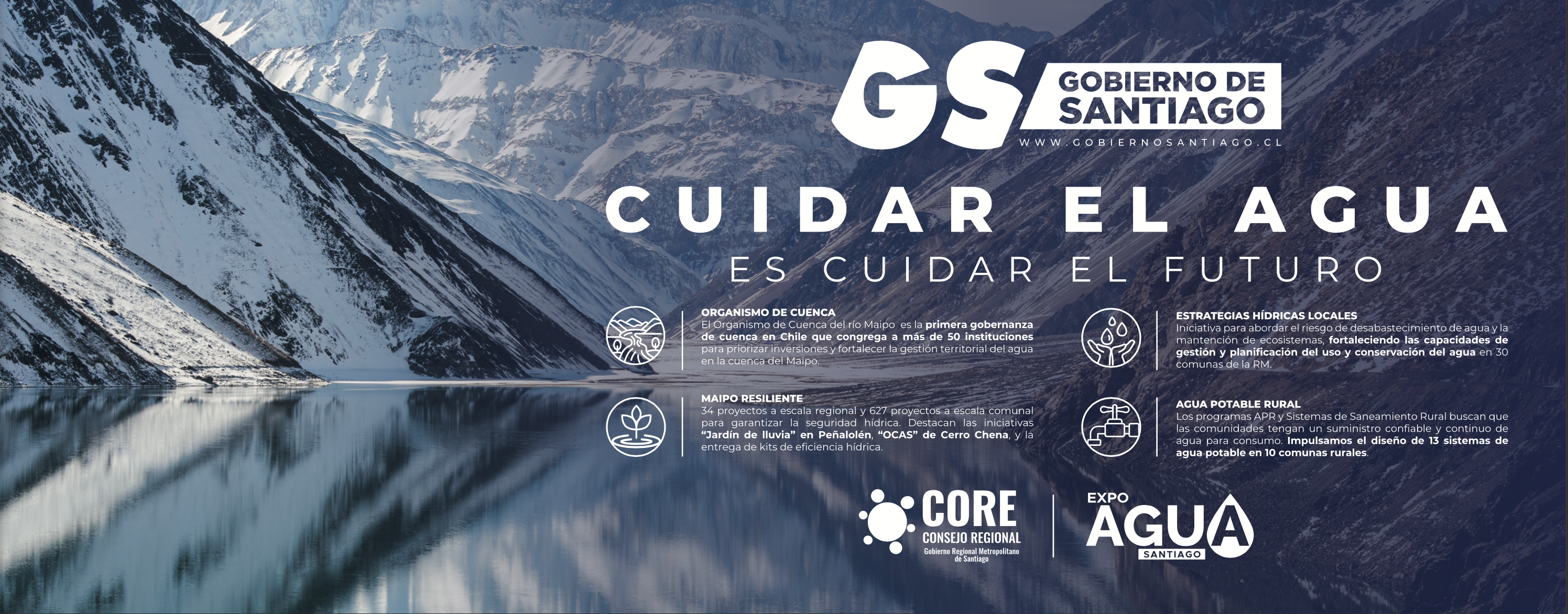 Progama levantado junto a la Agencia de Sustentabilidad y Cambio Climático (ASCC), que busca abordar el riesgo de desabastecimiento de agua para el consumo humano, la mantención de los ecosistemas y las actividades productivas en la región. Consiste en la creación de Estrategias Hídricas Locales (EHL), correspondientes a instrumentos de gestión hídrica municipal, de carácter participativo, que entrega una hoja de ruta para la planificación y ejecución de acciones que mejoren el uso y conservación del agua. Las EHL se implementan a través de Acuerdos de Producción Limpia (APL) y el financiamiento de proyectos hídricos priorizados. Gracias a este programa, las 52 comunas de la RM contarán con su EHL en el 2026, de las cuales 47 fueron financiadas por el Gobierno de Santiago.